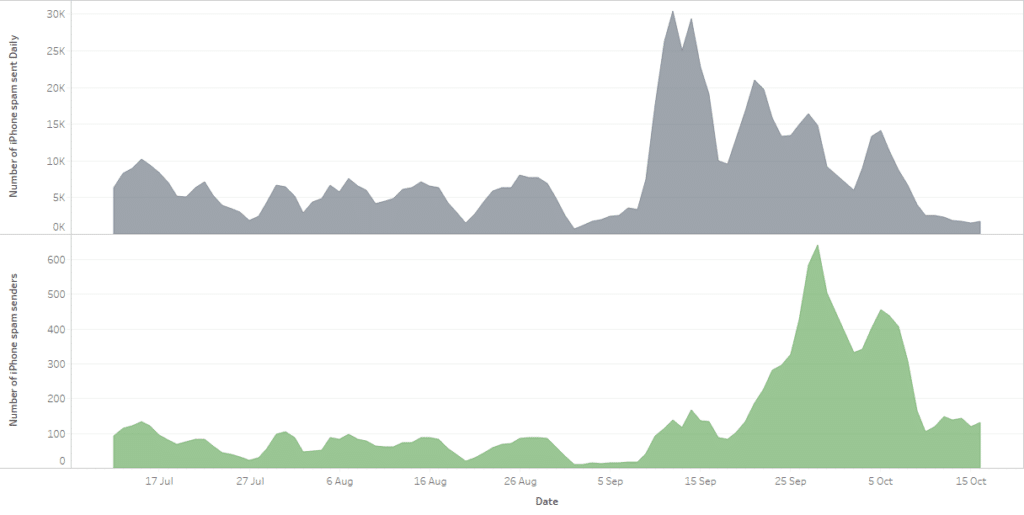 • To show this, the top graph below, is a moving average of total SMS spam activity from these iPhones detected within our customer operators in North America. You can see that the number of messages peaked in mid-September, and since then the overall volumes have declined. However, in the bottom graph, again using a moving average we can see that the number of active senders per day peaked later – at the end September/start October, and has actually remained higher than it was before the increase in mid-September.