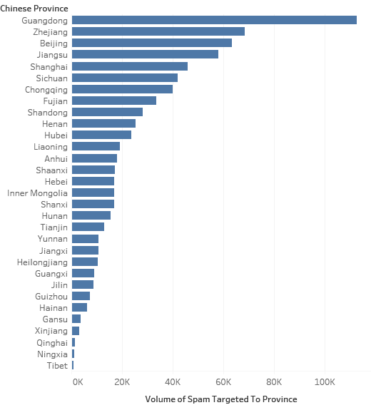 The target for these attacks is still Chinese recipients, in fact it is quite interesting if we plot out the recipient number by the province in which they are registered. To give some background, in China, like North America, mobile numbers can be allocated by range to the province to which they are registered from. Using this method, we can plot out out the main geographic focus of attacks.