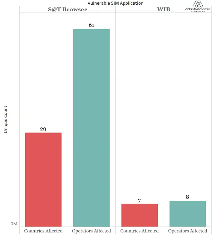The attack targets SIM Cards which contain a technology called the S@T Browser. The S@T Browser technology is used in at least 61 mobile operators, in at least 29 countries. A map is available in our report (and below) of what countries we believe still use the technology. As we also specify in our report, the most probable, conservative estimate is that mid to high hundreds of millions of SIM Cards globally are affected. While the S@T Browser specification may not have been updated since 2009 until now, it is still widely deployed. The SIM Card technology itself is independent of handset type, i.e. Android, iPhone, IoT type devices are all vulnerable if their embedded SIM Card uses the technology.